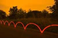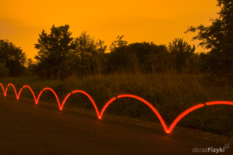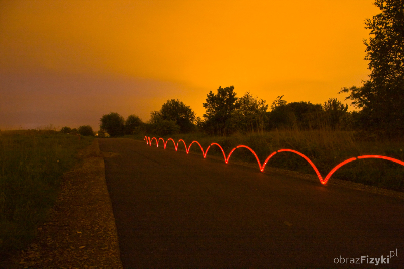 W jaki sposób zostały zrobione te zdjęcia? Użyty został następujący sprzęt: aparat, statyw, rower, lampka na baterie, kawałek równej asfaltowej drogi (dla bezpieczeństwa i spokoju wybrany poza ruchem). Cykloida w tym przypadku jest rysowana światłem tylnej lampki rowerowej na baterie, przymocowanej taśmą klejącą do obręczy przedniego koła roweru pomiędzy szprychami. Takie prowizoryczne mocowanie powinno być na tyle silne aby lampka nie odpadła w czasie jazdy. Przed jazdą należy też upewnić się czy lampka nie zawadza o widełki. Bardzo pomocną jest druga osoba, która będzie jeździć rowerem ze stałą prędkością po wskazanym odcinku. Chcąc uzyskać dłuższy fragment cykloidy najlepiej wszelkie nastawy aparatu, w tym czas naświetlania, robić w trybie manualnym. Czas naświetlania prezentowanych zdjęć wynosi 20, 30 sekund przy ISO 200. Długi czas naświetlania oznacza, że bez statywu lub ewentualnie czegoś na czym można stabilnie oprzeć aparat nie obejdzie się. Ponadto, aby zdjęcie było atrakcyjne oprócz samej cykloidy na zdjęciu powinno być też widać otocznie. I tak, jeśli jest zbyt ciemno na zdjęciu wyjdzie tylko cykloida. Poza tym jazda na rowerze w ciemności może skończyć się kraksą. Z kolei gdy jest zbyt jasno zdjęcie będzie prześwietlone. Latarnie uliczne również należy wziąć pod uwagę wybierając miejsce eksperymentu. Tak więc, porę o której będziemy fotografować trzeba dobrać metodą prób i błędów choć najprawdopodobniej będzie to w okolicach zmierzchu.